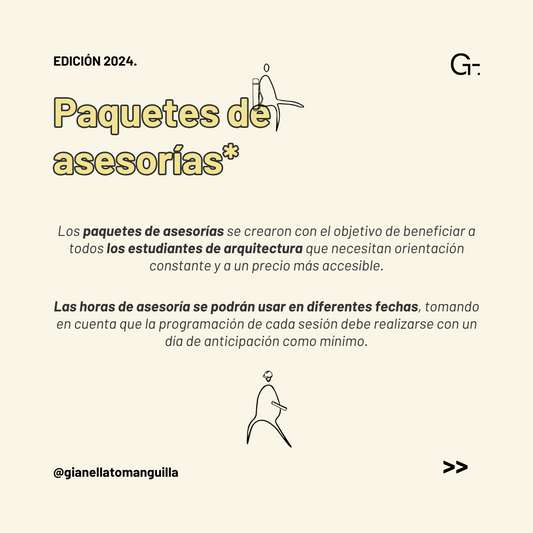Mi servicio de asesorías está disponible durante todo el año, ofreciendo un acompañamiento cercano y especializado para estudiantes de arquitectura en talleres, uso de softwares, desarrollo de tesis y etc.